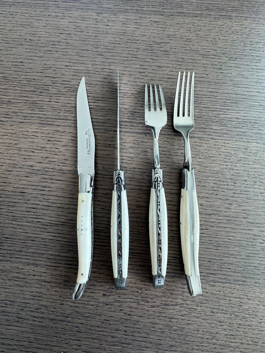 Laguiole en Aubrac Handcrafted 4-Piece Set With 2 Steak Knives and 2 Forks With Zebu Bone Handles, Polished Bolsters