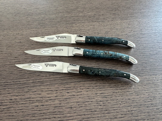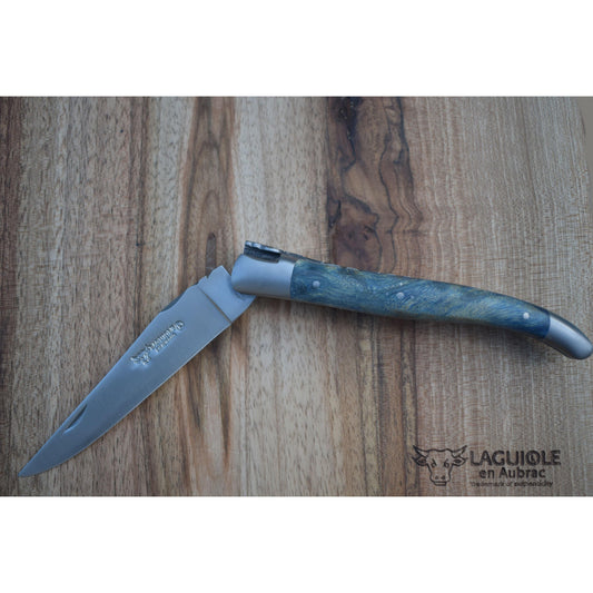 Laguiole en Aubrac Handcarved Plates Multipurpose Knife with Stabilized Blue Poplar Burl Handle, Polished Bolsters, 4.75-Inches