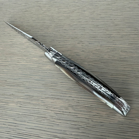 Laguiole en Aubrac Droit Luxury Multipurpose Knife With Handcarved Stainless Steel Spring, Brass Plates, Solid Horne Handle, 5.12-Inches
