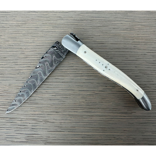 Laguiole en Aubrac Handcrafted Multilayer Damascus Double Plates Multipurpose Knife with Bone Handle, Brushed Bolsters4.75-Inches
