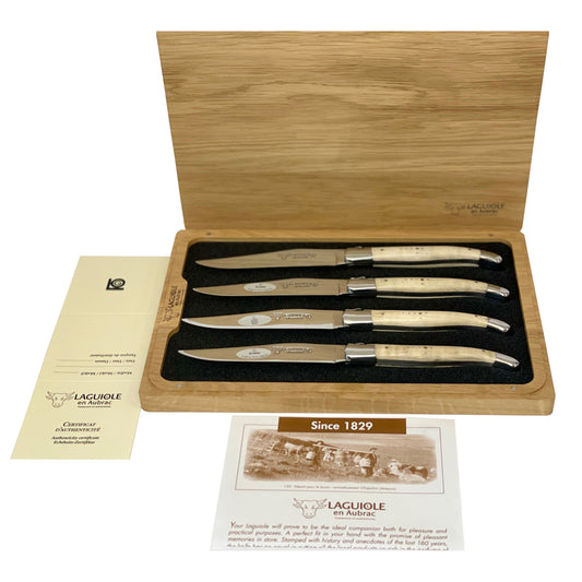Laguiole en Aubrac Handcrafted 4-Piece Steak Knife Set with Wavy Natural Maple Wood Handles