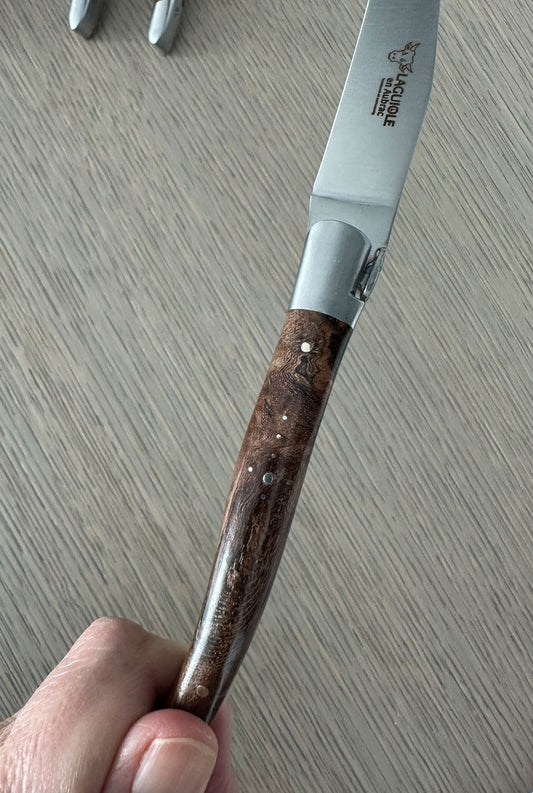 Laguiole en Aubrac Handcrafted 2-Piece Steak Knife Set with Blue Poplar Burl Handles, Polished Bolster