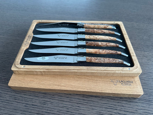 Laguiole en Aubrac Handcrafted 6-Piece Steak Knife Set with Lime Tree Burl Wood Handles, Polished Bolsters