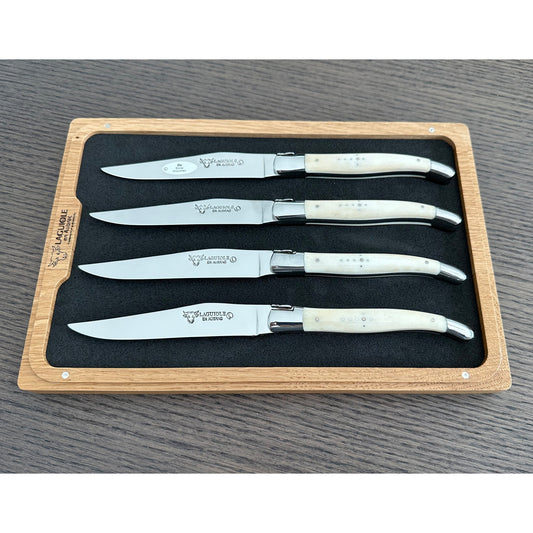 Laguiole en Aubrac Handcrafted 4-Piece Steak Knife Set with Zebu Bone Handles, Polished Bolsters