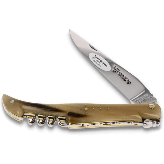Laguiole en Aubrac Handcrafted Plated Multipurpose Knife, Full Solid Horn Handle with Corkscrew, 4.75 inches