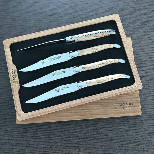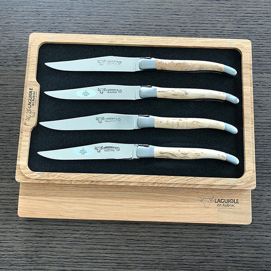 Laguiole en Aubrac Handcrafted 4-Piece Steak Knife Set with Birchwood Handles, Polished Bolster