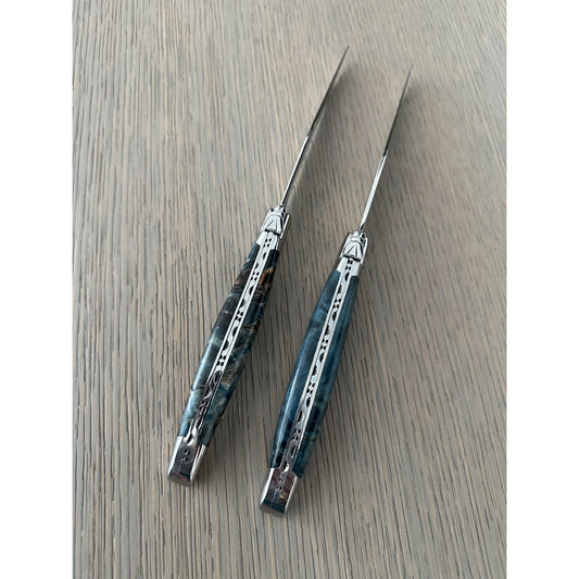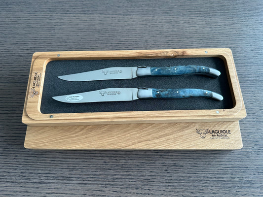 Laguiole en Aubrac Handcrafted 2-Piece Steak Knife Set with Blue Poplar Burl Handles, Polished Bolster