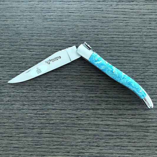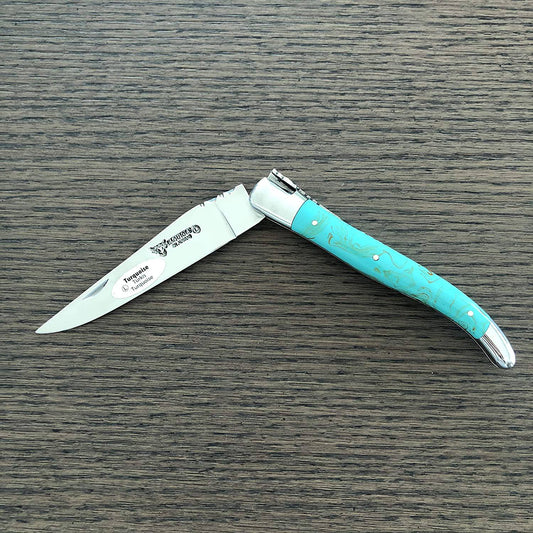 Laguiole en Aubrac Cuchillo multiusos chapado a mano con refuerzos brillantes, mango turquesa, 4.75 pulgadas