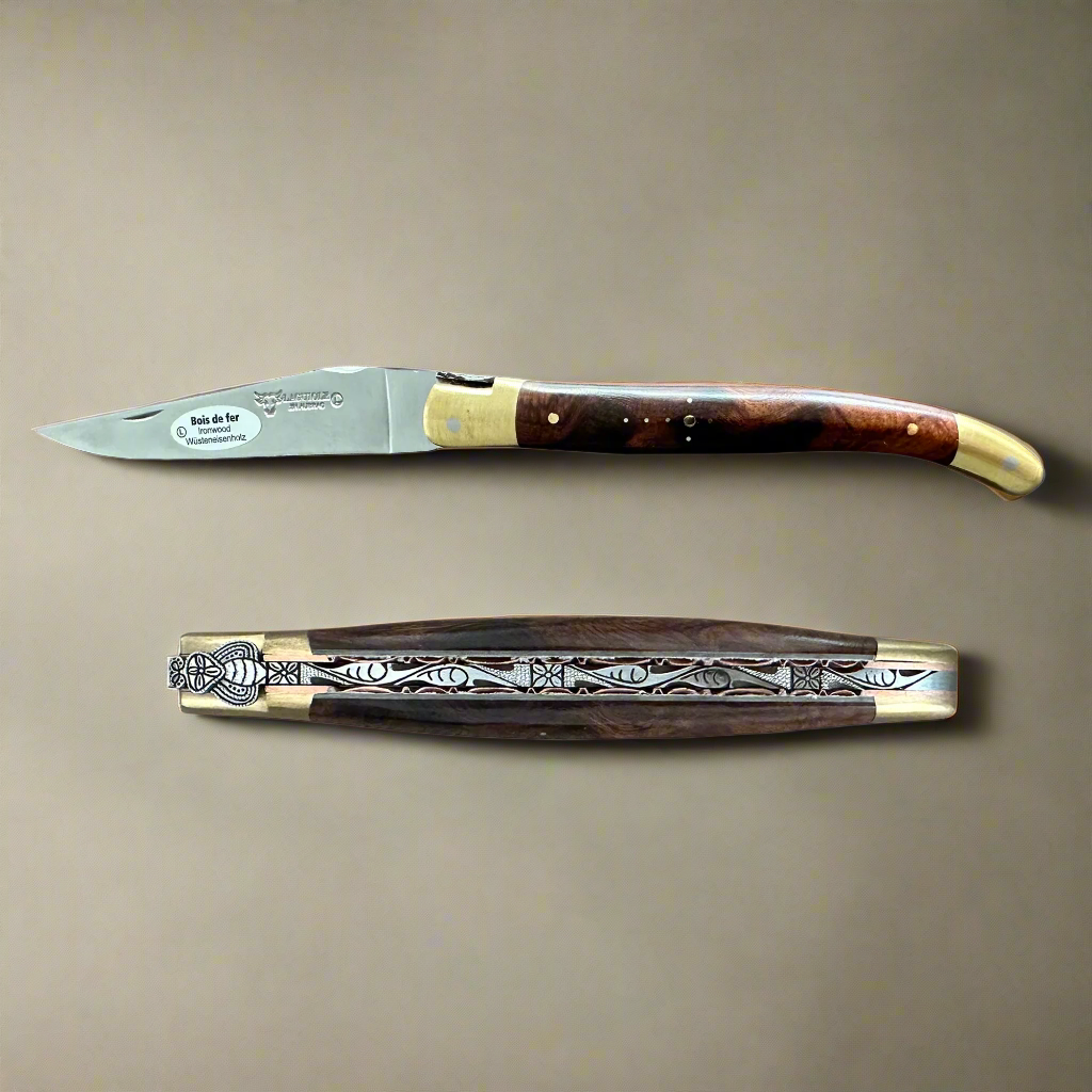 Laguiole en Aubrac Le Bijou Luxury Multipurpose Knife, 4.8-in (12cm), Ironwood Burl Handle, With Brass Bolsters, And Two Copper Plates