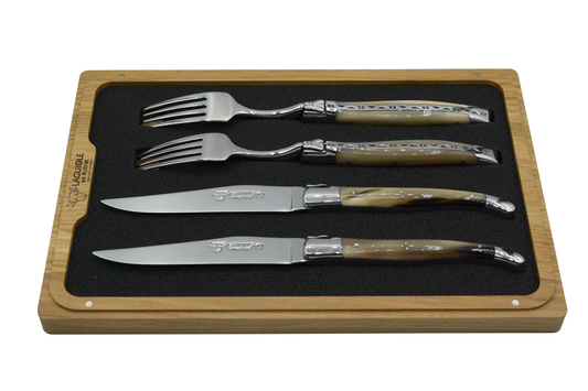 Laguiole en Aubrac手作りの4ピースセット、2つのステーキナイフと2つのフォーク(ソリッドホーンハンドル付き)