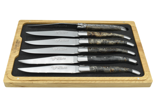 Laguiole en Aubrac手作りのメッキ6ピースステーキナイフセット、黒くしたポプラバールウッドハンドル、ブラッシュドボルスター