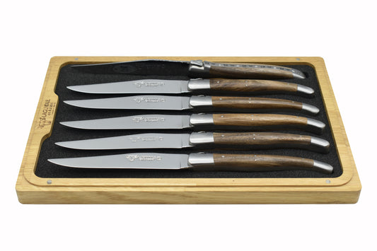 Laguiole en Aubrac手作りのメッキ6ピースステーキナイフセット、ミックスバールウッドハンドル、ポリッシュボルスター
