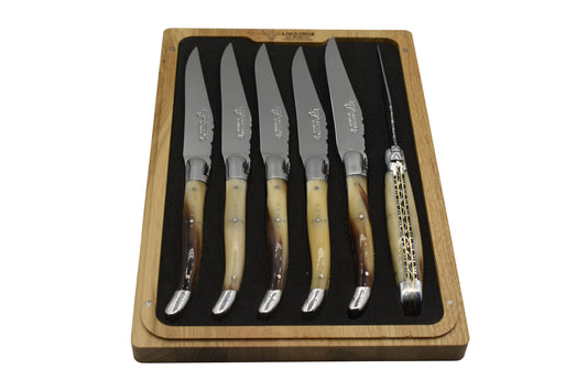 Laguiole en Aubrac高級手作りステンレス鋼&真ちゅう二重メッキ6ピースステーキナイフセット、ソリッドホーンハンドル付き