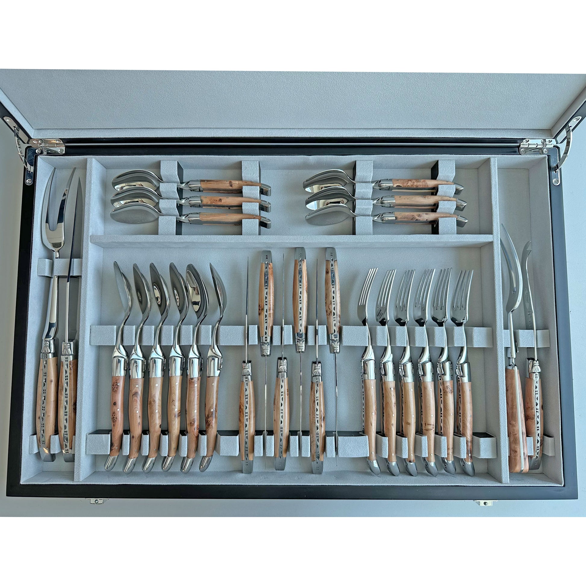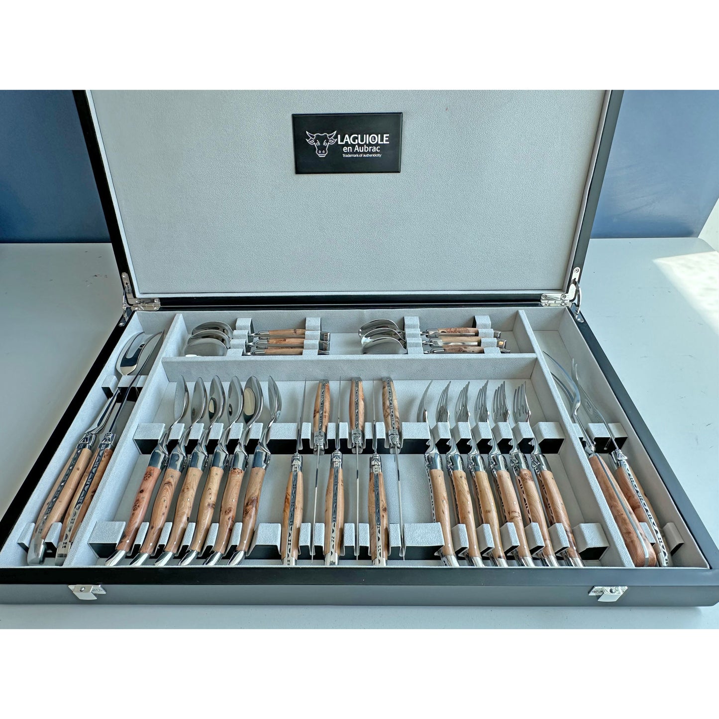 Laguiole en Aubrac Luxury 28-Piece Handcrafted Flatware Set, Juniper Wood Handles Polished Bolsters