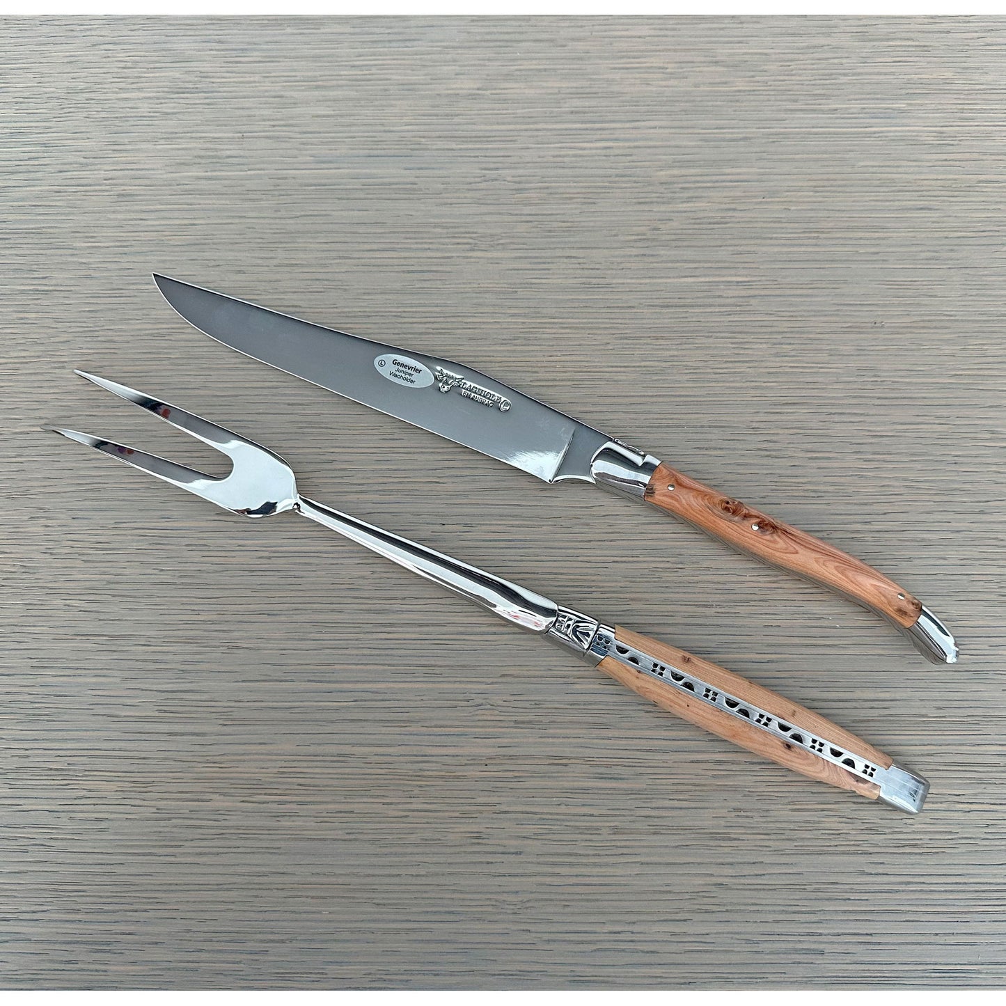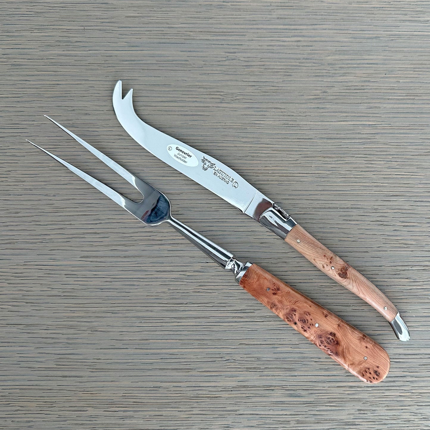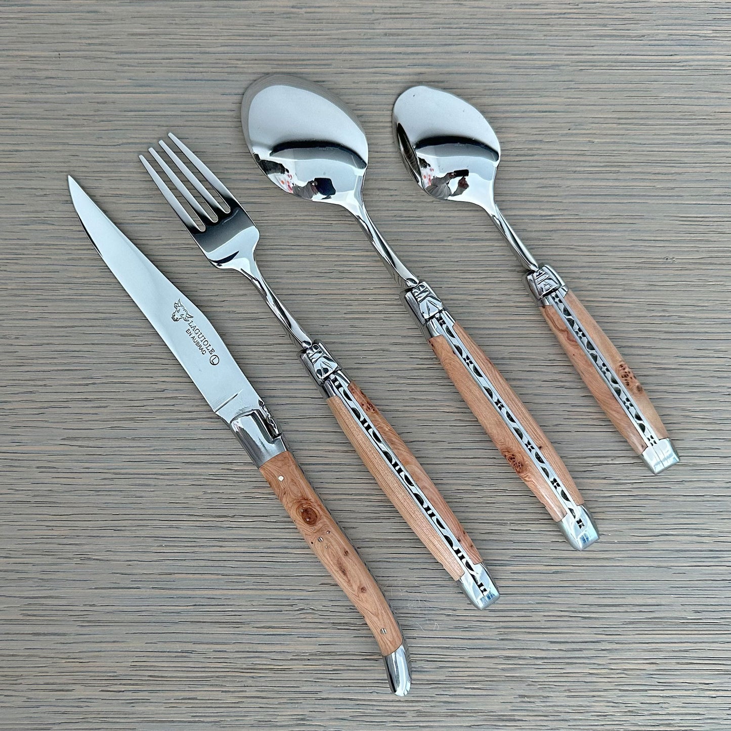 - Set of 28 heirloom-quality, handcrafted French Forks, Knives, Carving Set, Cheese Set, Soup & Tea Spoons with juniper wood handle, shiny stainless steel blades and bolsters