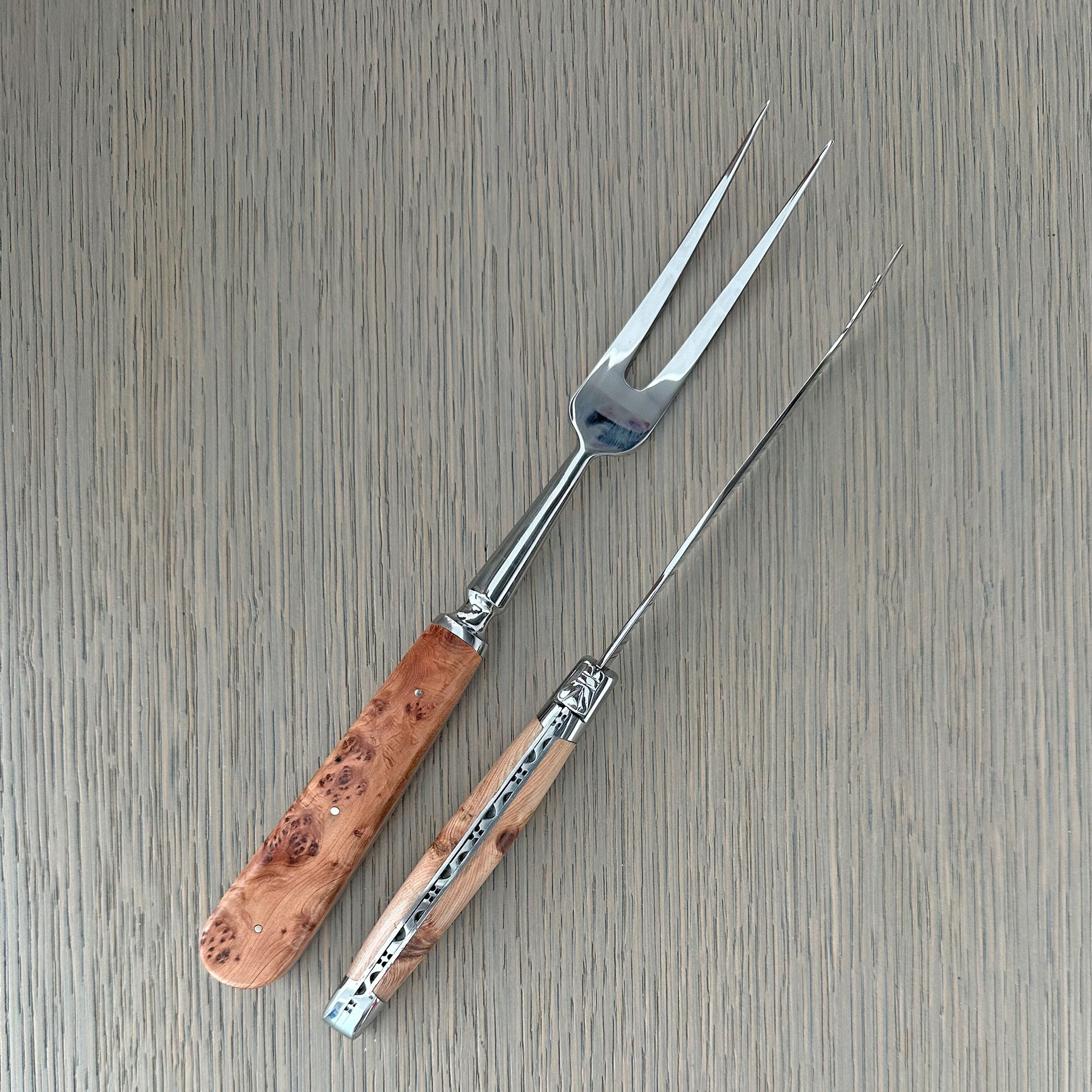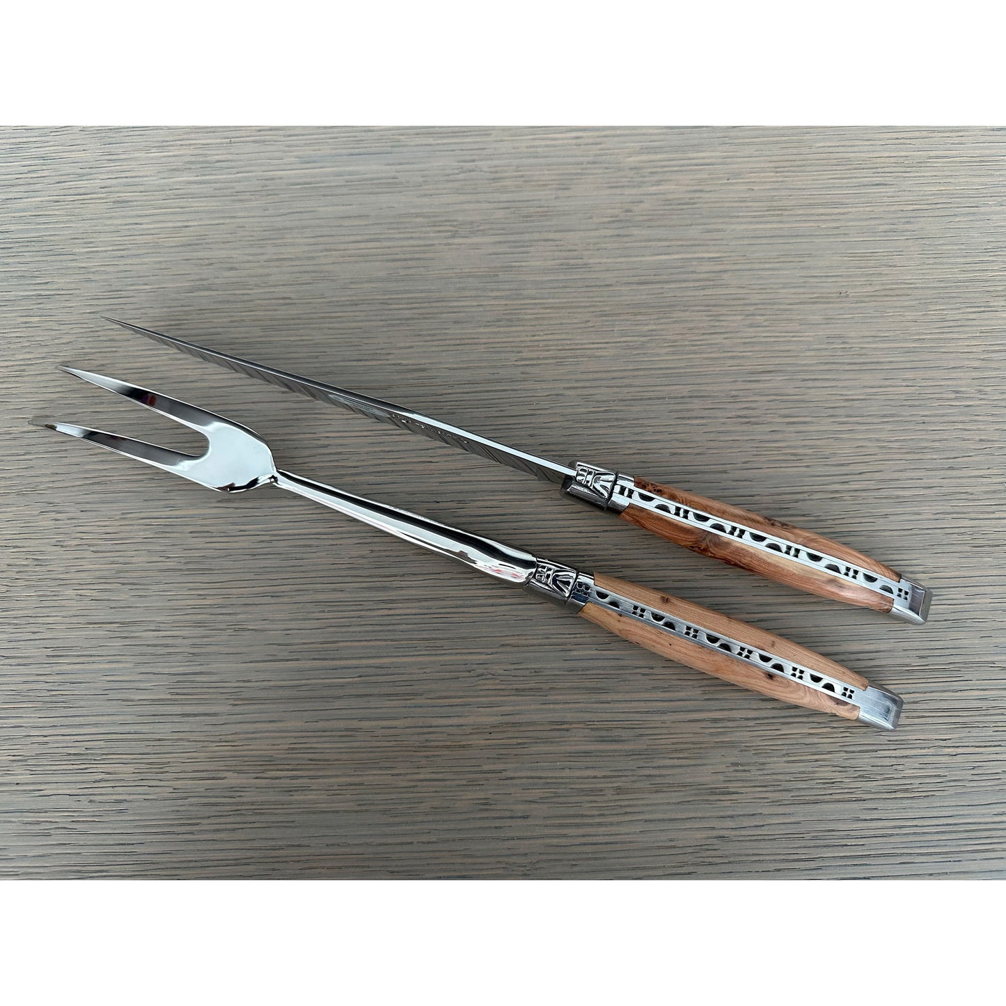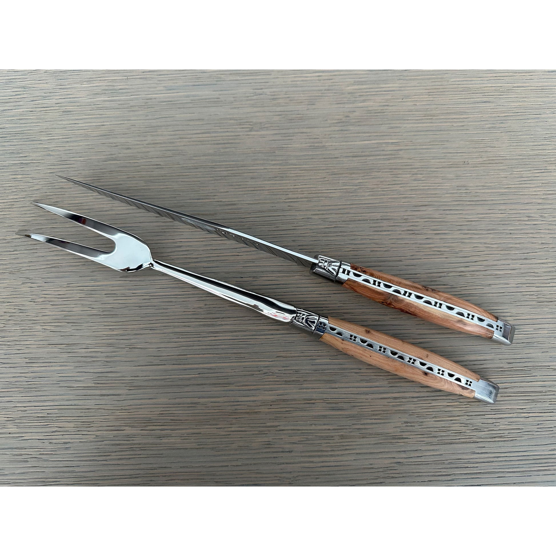 - Set of 28 heirloom-quality, handcrafted French Forks, Knives, Carving Set, Cheese Set, Soup & Tea Spoons with juniper wood handle, shiny stainless steel blades and bolsters