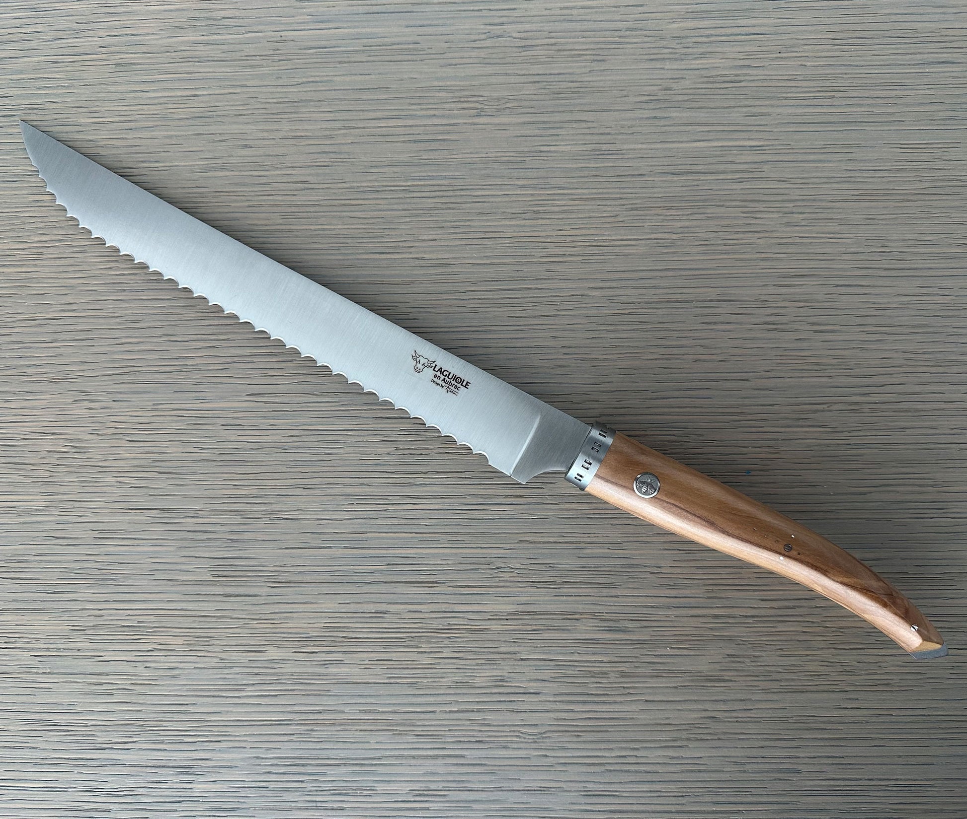 Laguiole en Aubrac Gourmet Cuisine Stainless Fully Forged Steel Bread Serrated Knife with Olive Wood Handle, 9-in