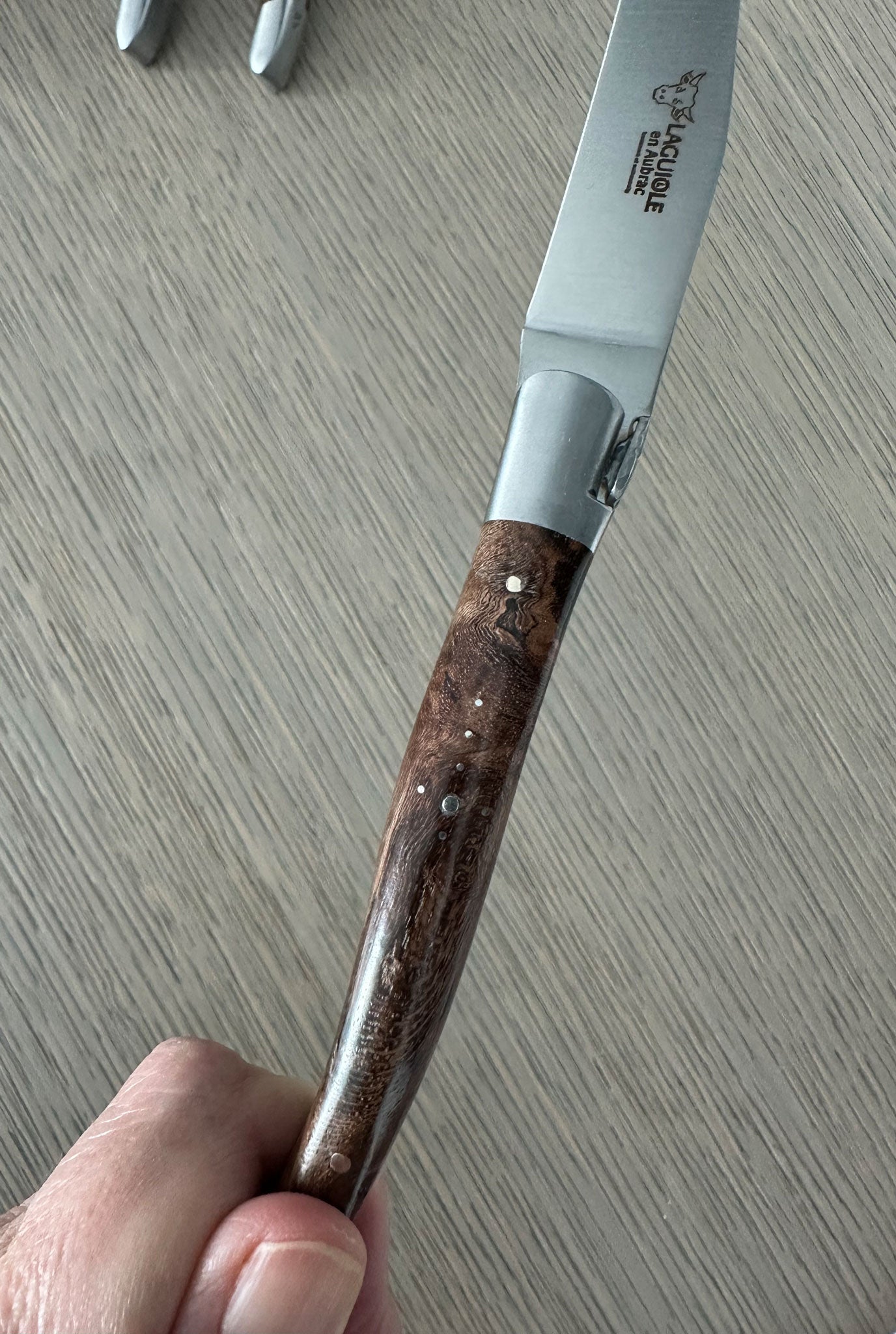 - Handcrafted French table / steak knife with Grapevine Wood handle, stainless steel bolsters