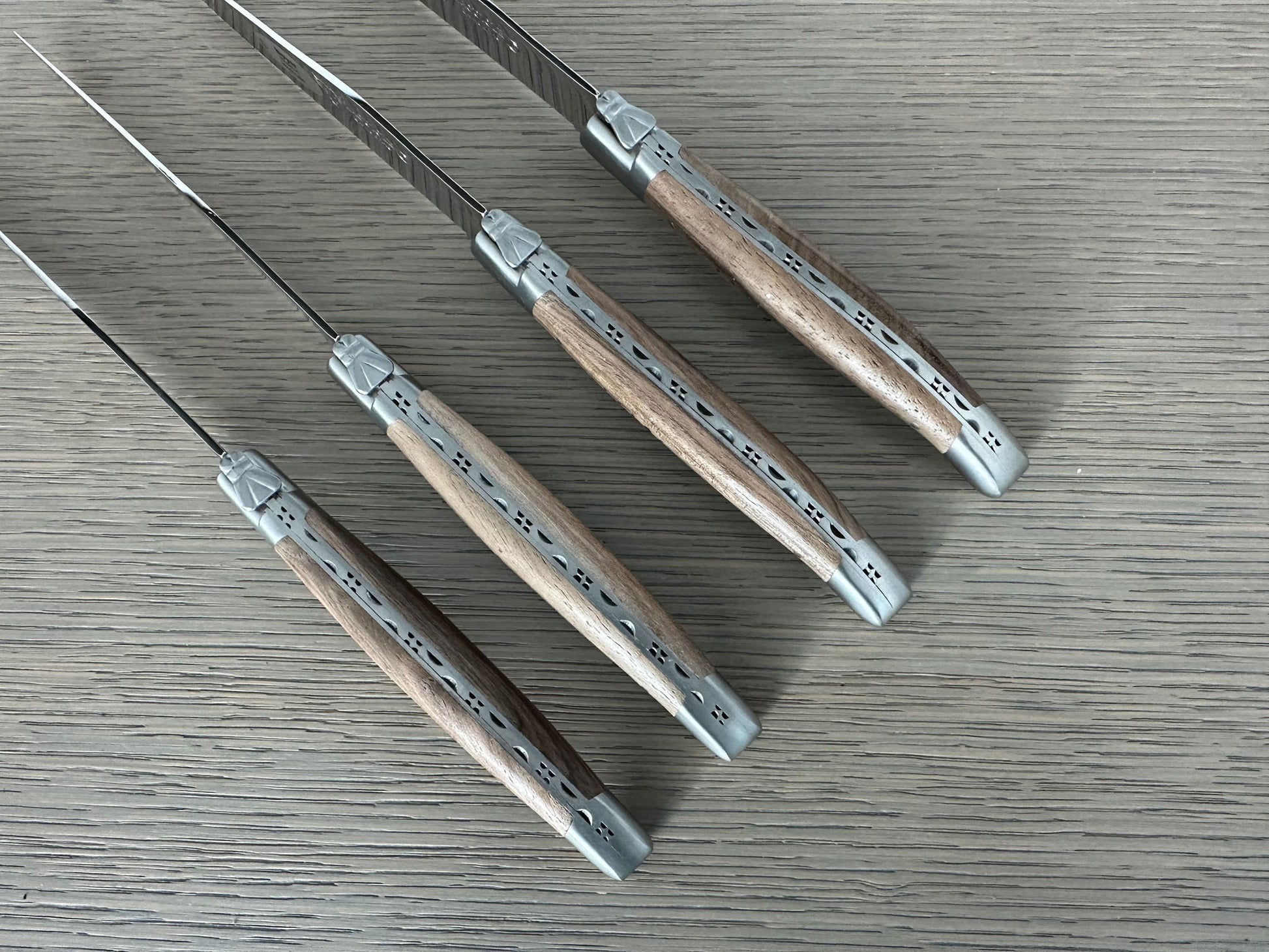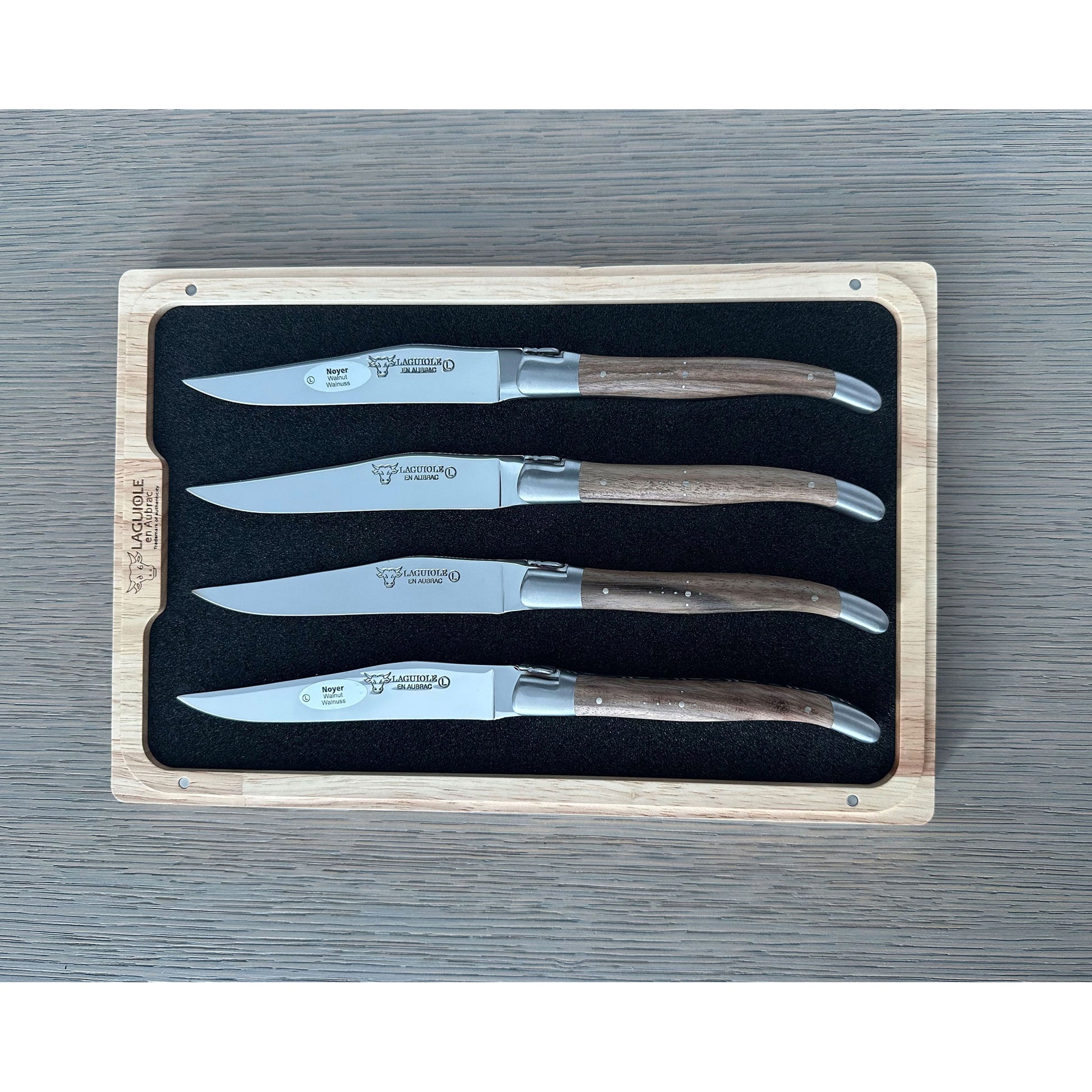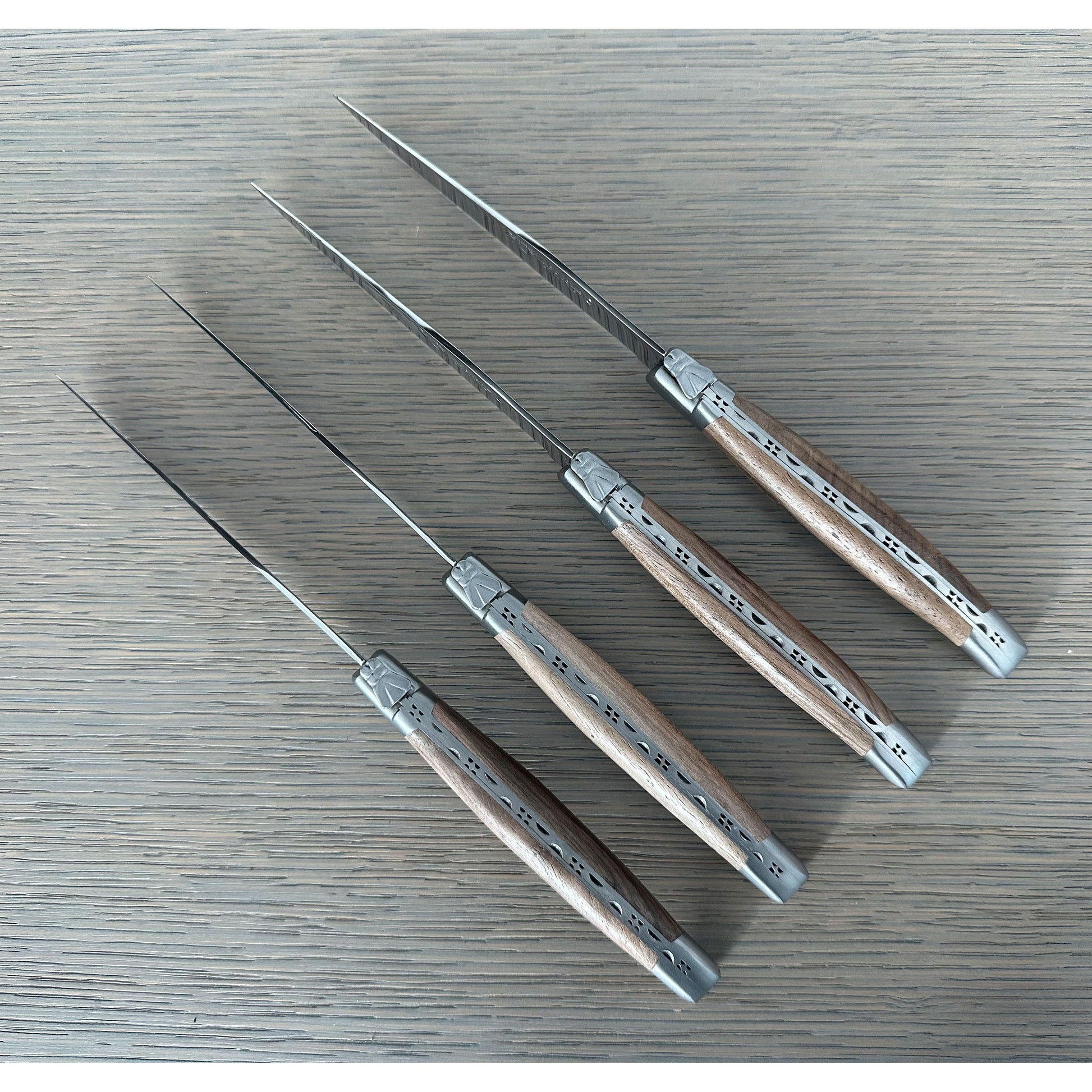 - 一套 6 把传家宝品质的手工法式牛排刀,带有胡桃木手柄、拉丝不锈钢刀片和拉丝饰面不锈钢垫。 每个都在把手上展示了传统的“牧羊人十字架”。